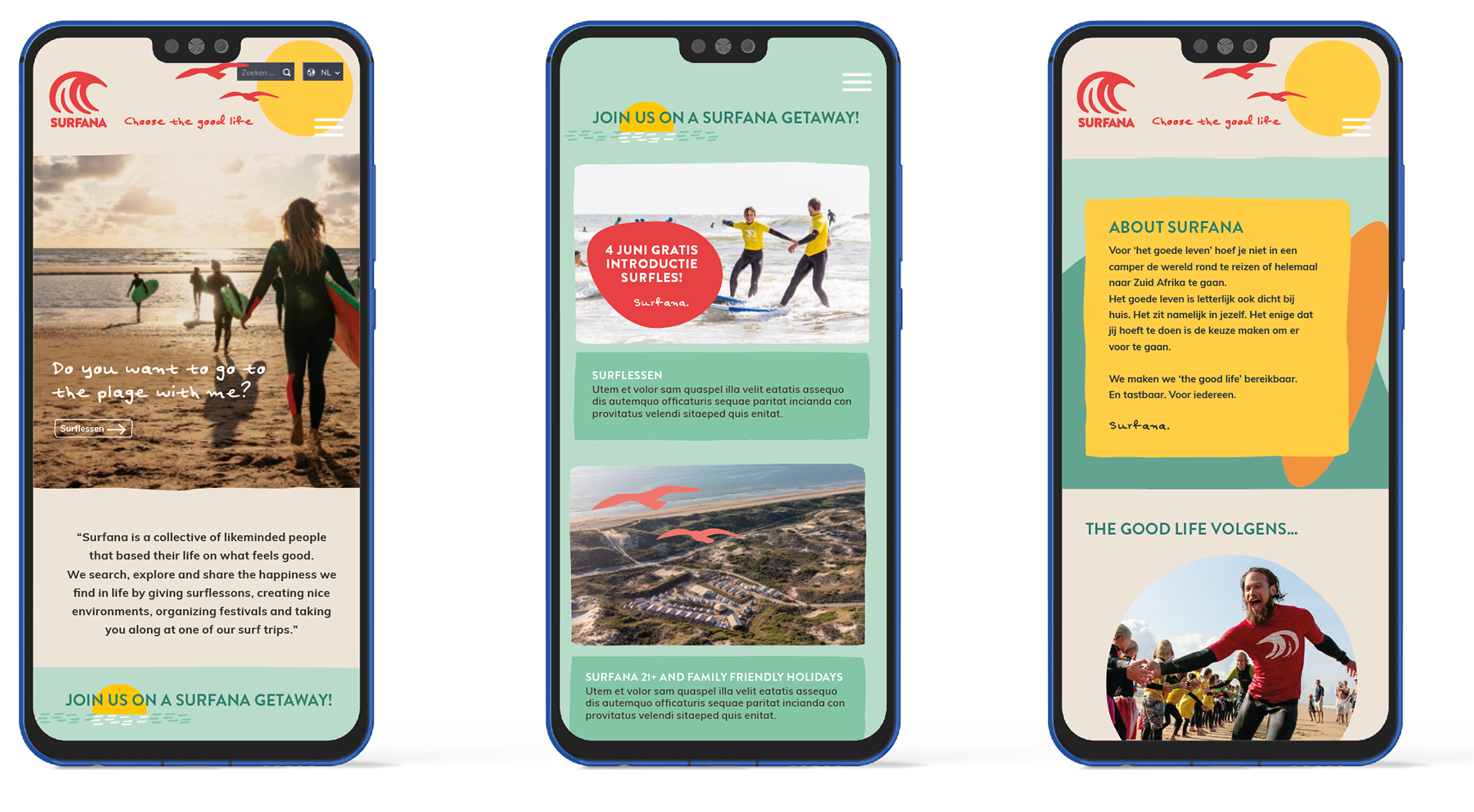 Surfana heeft surfscholen langs de hele Nederlandse kust en is zoveel meer. Succesvol, maar ze zaten vast met hun huisstijl. Er was een start gemaakt met een ontwerper, maar het gevoel klopte gewoon niet. Na een brandsessie kwamen we tot de kern, kiezen voor het goede leven. Niet in Zuid Afrika of Australië, maar dichtbij. Gewoon naast je baan of gezinsleven. Dat was het startpunt en nu klopt het. Het logo, de kleuren, de graphics ademen vrijheid, strand en plezier. Helemaal Surfana.